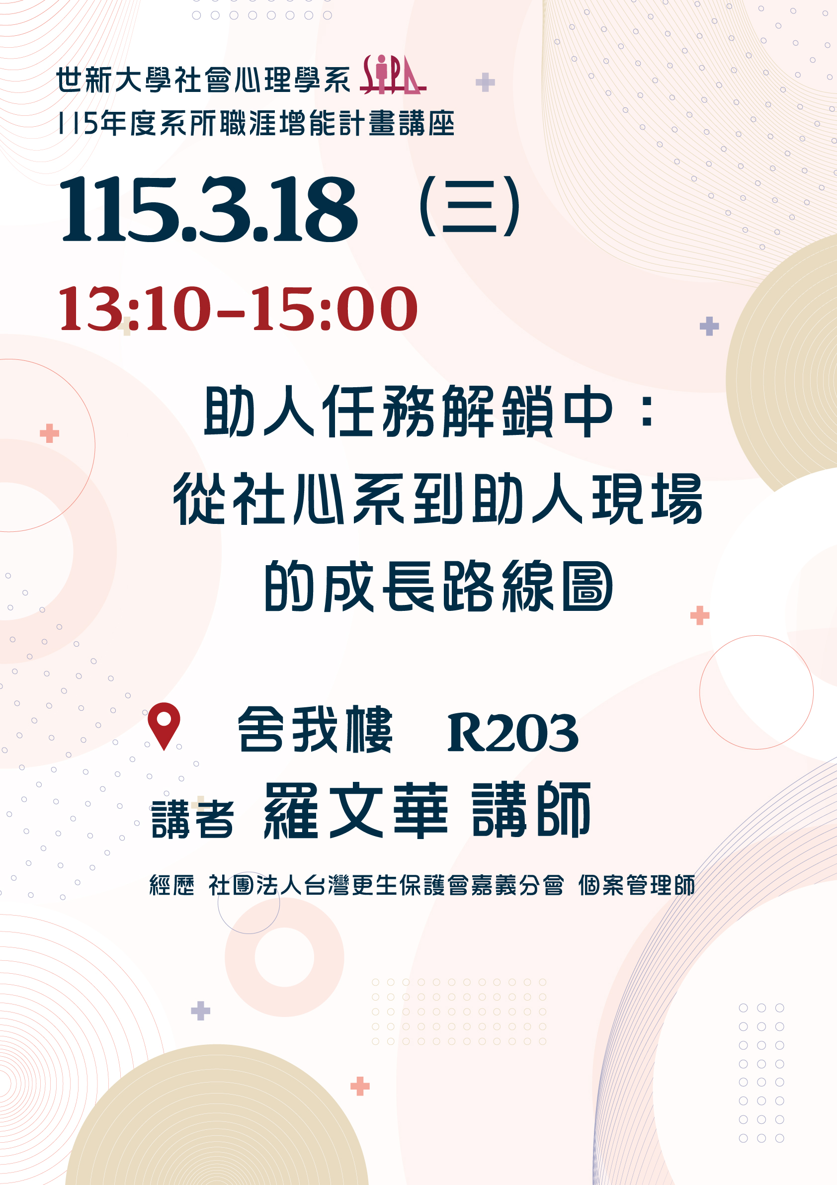 【115年度系所職涯增能講座】生活與工作中的社心
